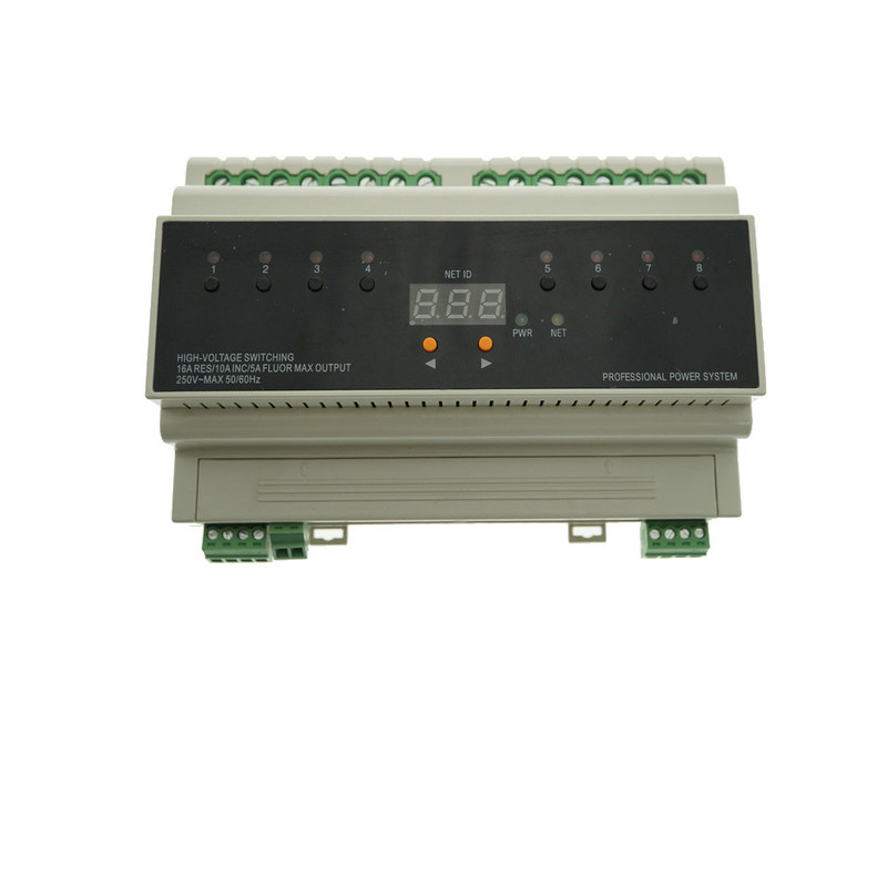 ДИН-РЭЛ8 отсек управления освещения 8 каналов конструированный для того чтобы поддержать переключение нон-диммабле освещения и вентиляторов. Одиночная модель поддерживает и применения 120 и 220-240 вольт. Каждый канал регулирует раскаленные добела нагрузки до 10 Ампс, дневные нагрузки до 5 Ампс, и также моторы ХП 1/2. Поддерживает множественные контролируя протоколы как ДМС, МодБус РТУ, МодБус АСКИИ, и неон протоколов третьей стороны/холодный катод, дневной, моторы. Наши продукты обширно приложены в освещении гостиницы, на открытом воздухе освещении.